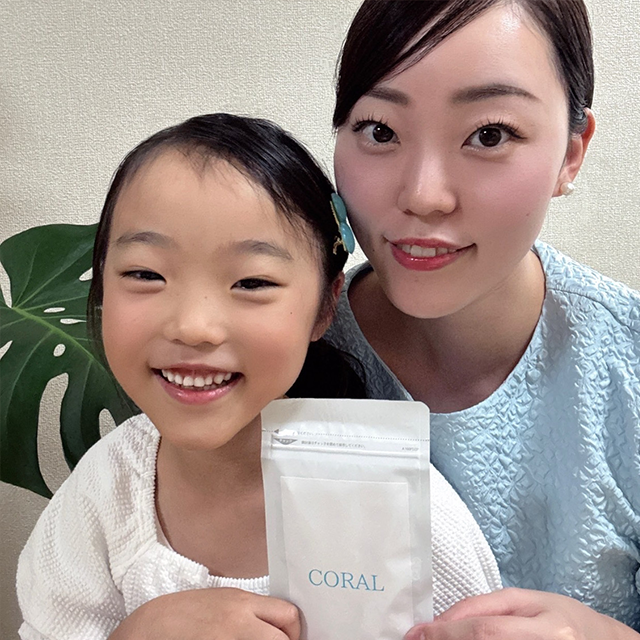 CORALを飲み始めて、止まっていた生理が毎月きちんと来るようになり、生理痛も消失。産後からの強いイライラも和らぎ、娘から「怒らなくなったね」と言われ親子で笑顔が増えました。咳や夜驚症に悩んでいた娘も改善し、風邪や発熱で休むこともなくなり朝までぐっすり。親子に欠かせない存在です。