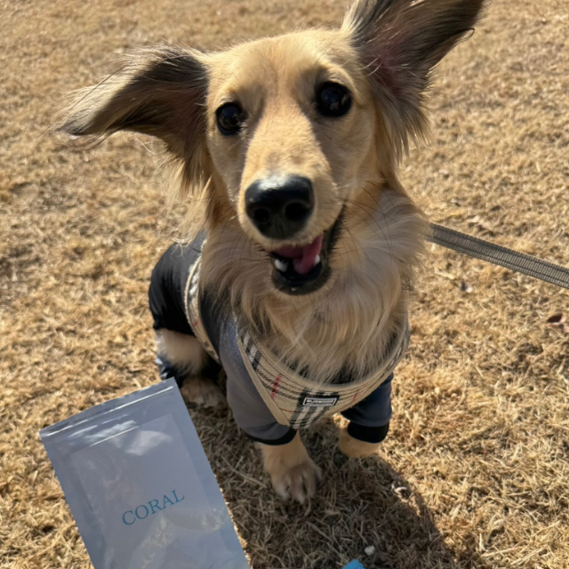 7歳のある日、突然震えて歩けなくなり夜間救急へ。「おそらくヘルニア」と言われ、鎮痛剤と安静を勧められました。外を気にする姿に胸を痛めながら、CORALサプリメントとCORAL Gelée ORAL RESETを開始。朝晩1粒とジェリーをこまめに続けると少しずつ元気を取り戻し、鎮痛剤を使わず走れるまでに回復。
